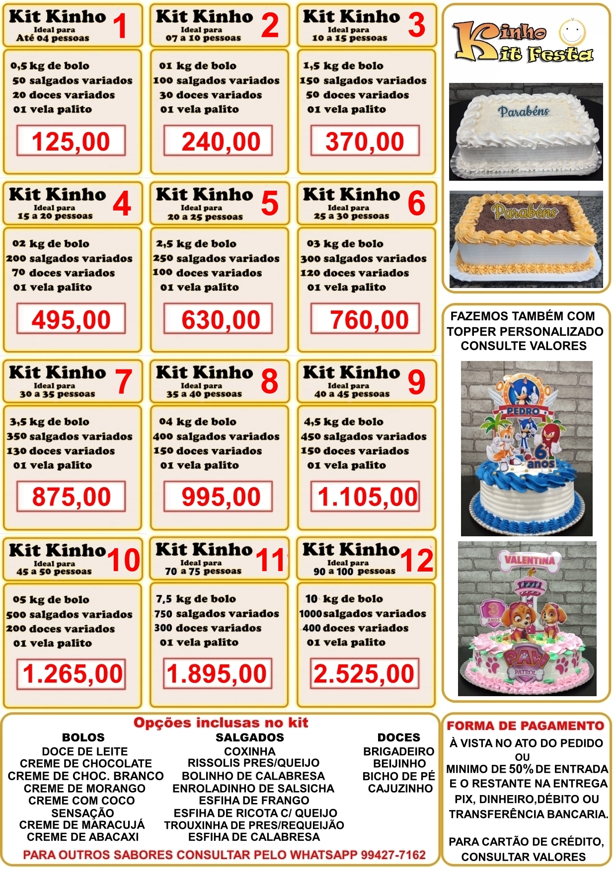 Kinho Kit Festas, serviços diversos, Bolos, Doces, Salgados, produtos de primeira qualidade e preço acessível para todo tipo de festa.